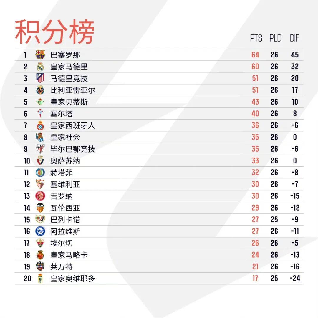 北京时间3月3日凌晨,西甲第26轮最后一场比赛落下帷幕,联赛第二的皇家马德里客场爆冷不敌赫塔费,遭遇联赛两连败,由于此前先赛的巴塞罗那4比1大胜黄潜,巴萨的领先优势扩大至4分;马德里竞技客场1比0击败联赛倒数第一皇家奥维耶多,积分追平比利亚雷亚尔,并凭借净胜球优势反超来到第三位,黄潜落至第四位;皇家贝蒂斯2比2战平塞维利亚后,积43分排名第五,塞尔塔客胜赫罗纳后积40分排名第六。